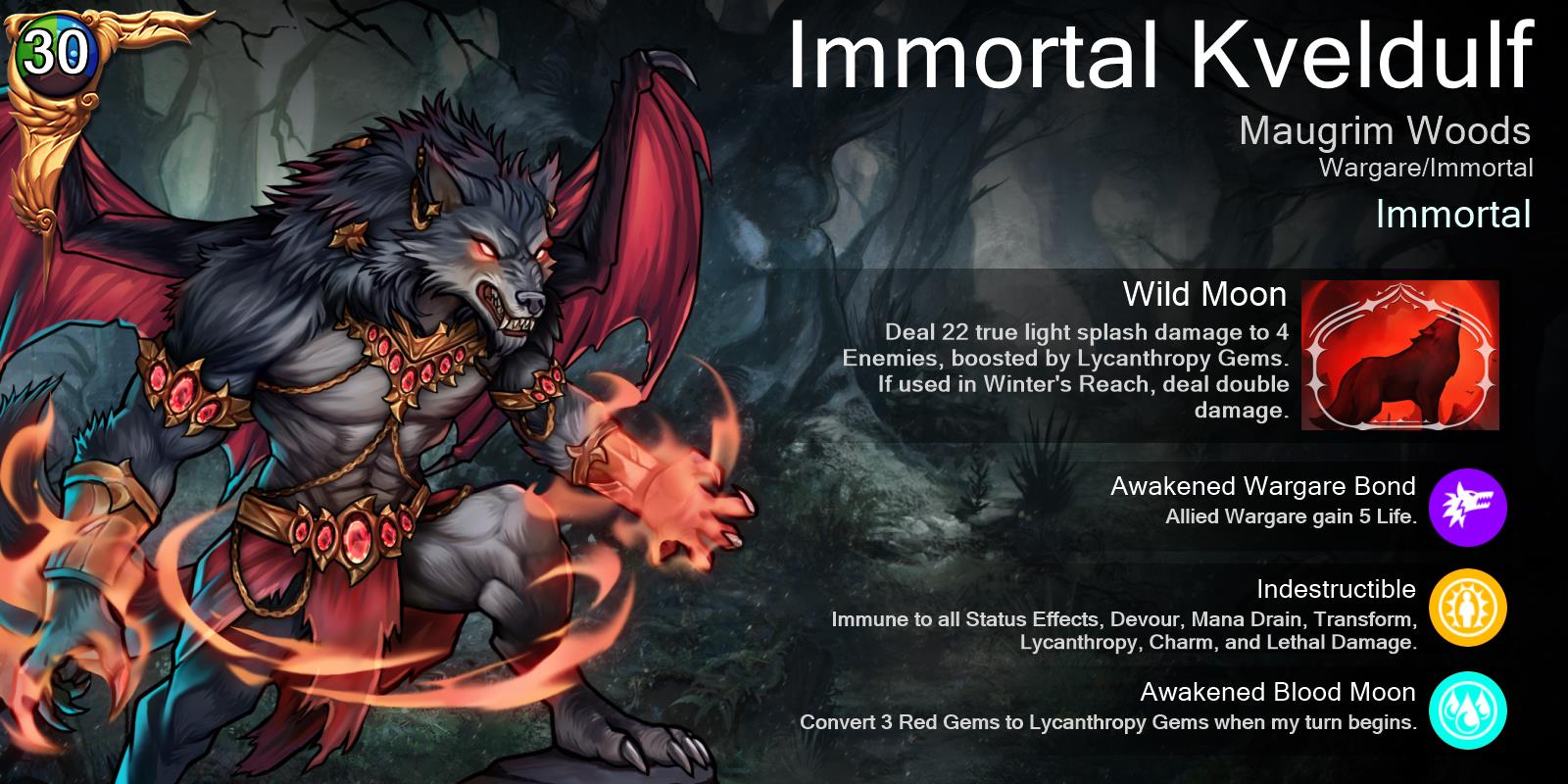 Immortal Kveldulf is the featured Immortal during the Season of the Wild. Earn her Immortal Souls from the Season Pass and Gold Season Goals. You will also be able to earn Immortal Souls for her in Burning Chests.