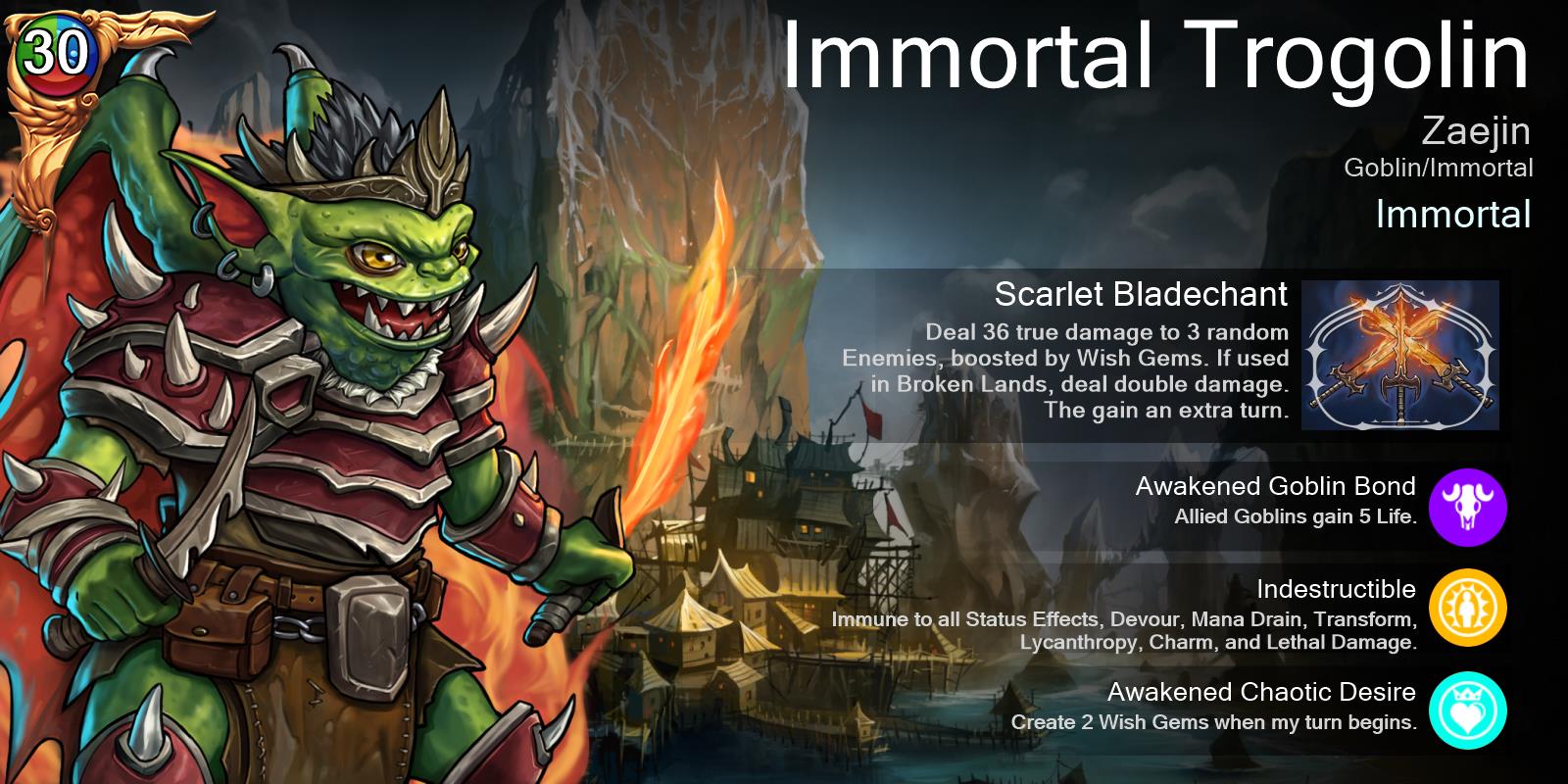Immortal Trogolin is the featured Immortal during the Season of Mischief. Earn her Immortal Souls from the Season Pass and Gold Season Goals. You will also be able to earn Immortal Souls for her in Burning Chests.